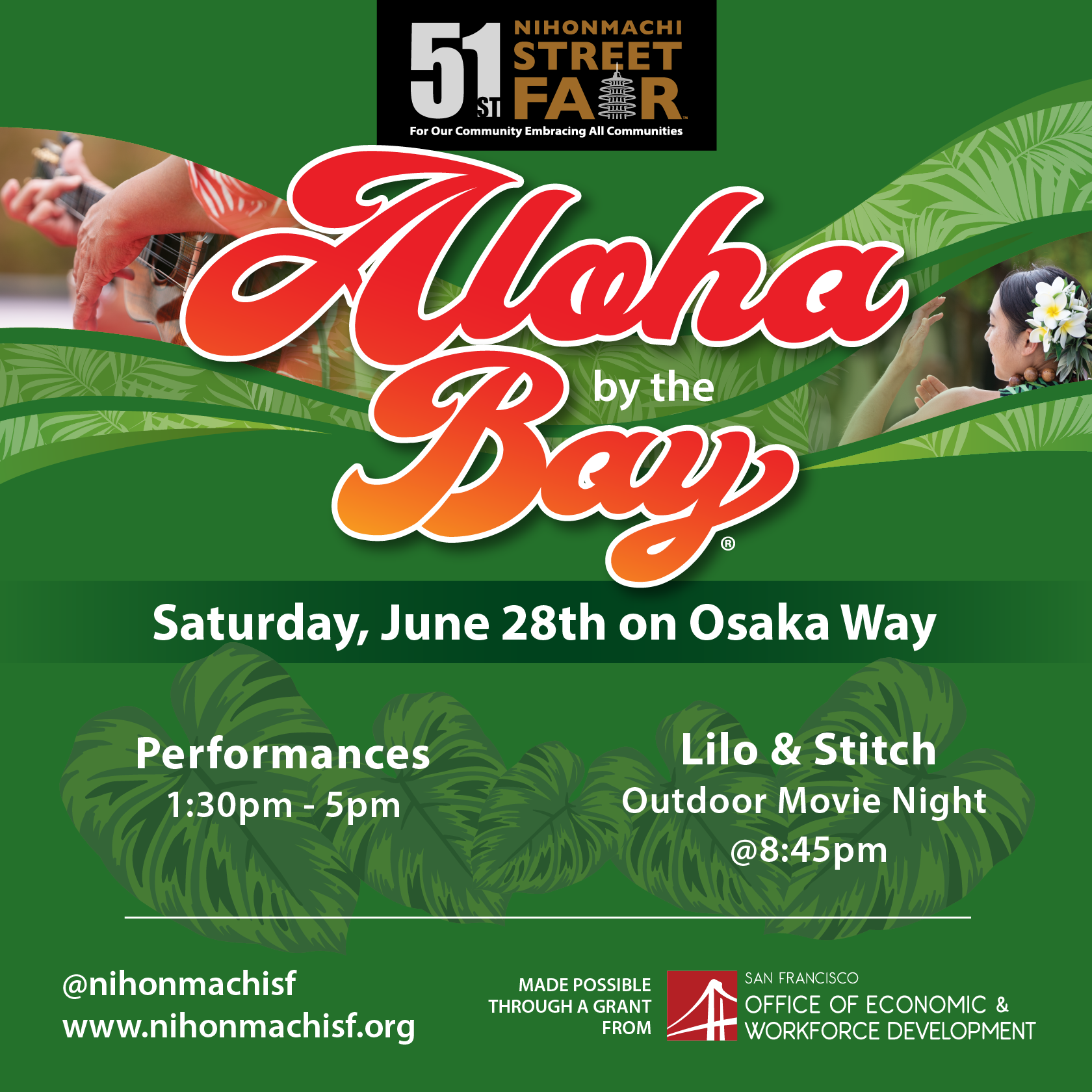 Get a vibrant preview of the Nihonmachi Street Fair with our exciting Pop-Up series right here in Japantown! Join us for Our Community Our Pride, kicking off AAPI Heritage Month with community spirit. Experience the warmth of the islands at Aloha by the Bay™, bringing the spirit of aloha to Jtown. And immerse yourself in the soulful connection of Kokoro Soul, uniting the vibrant energies of Japantown and the Western Addition, and Jtown Funk bringing together many of our Japanese/Japanese American musicians,Follow us for dates, times, and locations for these special pre-fair celebrations!